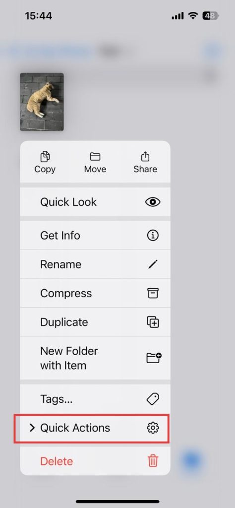 - Important: don’t open the image—long press the thumbnail in the folder view, and find Quick Actions.