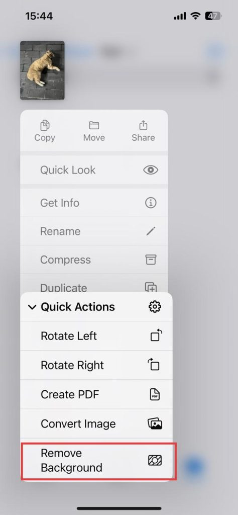 - In Files: long press the image thumbnail → Quick Actions → Remove Background.