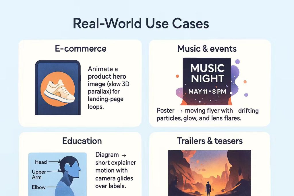 - E-commerce: Animate a product hero image (slow 3D parallax) for landing-page loops.
