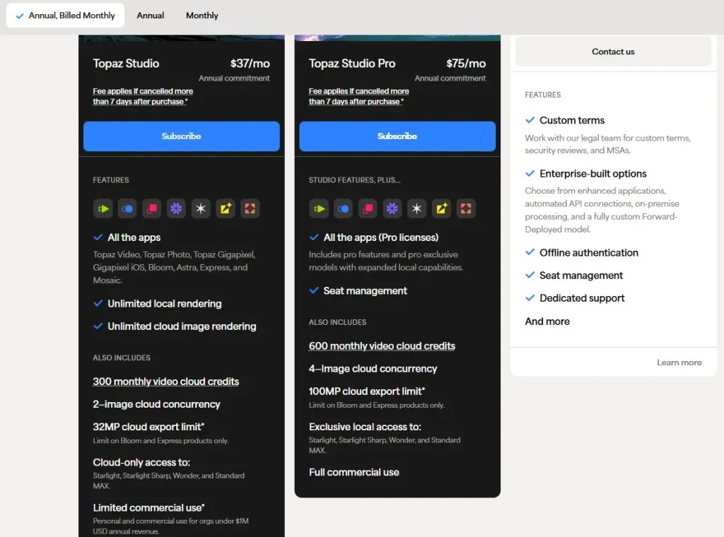 Compare this to the previous Topaz Video AI one-time purchase of approximately $299 for a perpetual license. Over three years, the new subscription costs at least $1,197 versus a single $299 payment.
